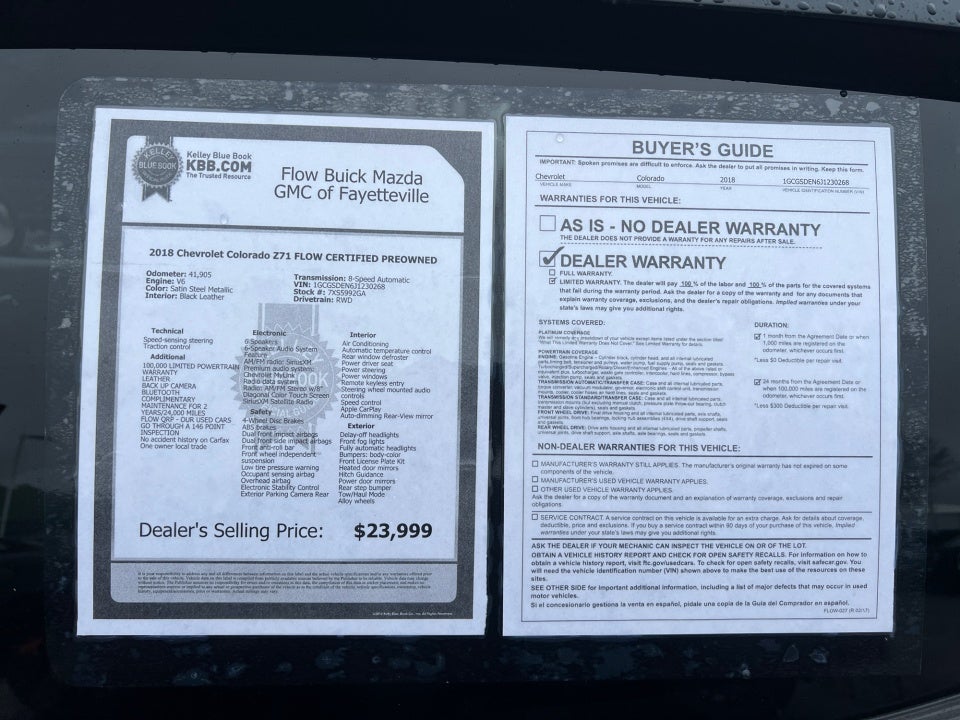 Flow Buick Mazda GMC of Fayetteville is proud to offer this outstanding-looking 2018 Chevrolet Colorado Satin Steel Metallic Z71 with the following features: FLOW CERTIFIED 2YR/100 000 MILE POWERTRAIN WARRANTY 3 day money back guarantee and a free maintenance package! ** 100 000 LIMITED POWERTRAIN WARRANTY LEATHER BACK UP CAMERA Bluetooth® COMPLIMENTARY MAINTENANCE FOR 2 YEARS/24 000 MILES FLOW QRP - OUR USED CARS GO THROUGH A 146 POINT INSPECTION No accident history on Carfax One owner local trade Colorado Z71 FLOW CERTIFIED PREOWNED 4D Crew Cab V6 8-Speed Automatic RWD Satin Steel Metallic Black Leather. Priced below KBB Fair Purchase Price!