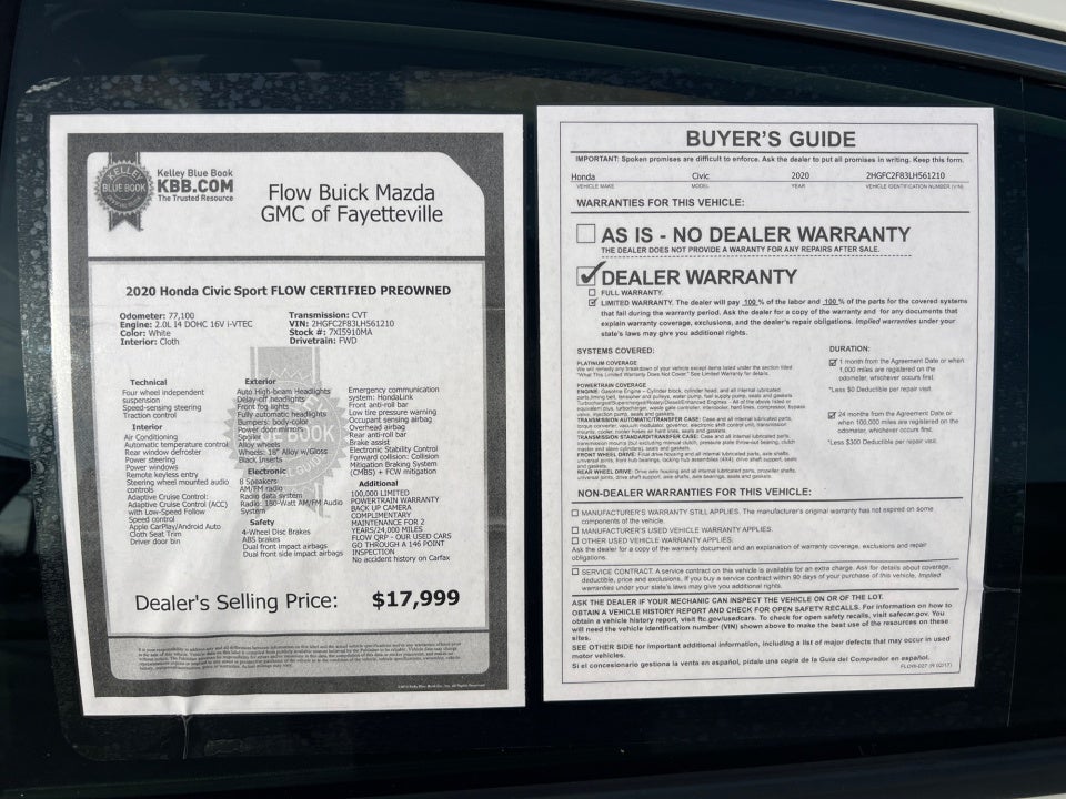 Flow Buick Mazda GMC of Fayetteville is proud to offer this wonderful 2020 Honda Civic White Sport with the following features: FLOW CERTIFIED 2YR/100 000 MILE POWERTRAIN WARRANTY 3 day money back guarantee and a free maintenance package! ** 100 000 LIMITED POWERTRAIN WARRANTY BACK UP CAMERA COMPLIMENTARY MAINTENANCE FOR 2 YEARS/24 000 MILES FLOW QRP - OUR USED CARS GO THROUGH A 146 POINT INSPECTION No accident history on Carfax Civic Sport FLOW CERTIFIED PREOWNED 4D Sedan 2.0L I4 DOHC 16V i-VTEC CVT FWD White Gray Cloth. Priced below KBB Fair Purchase Price!