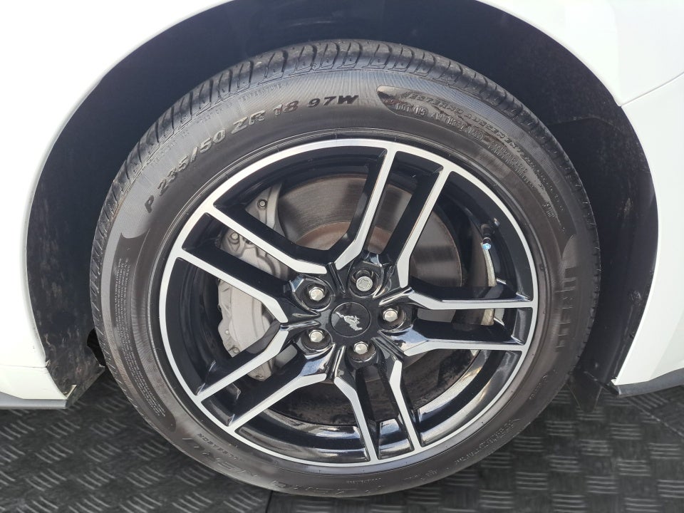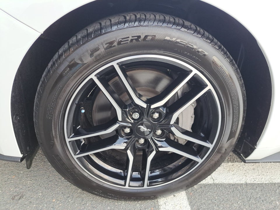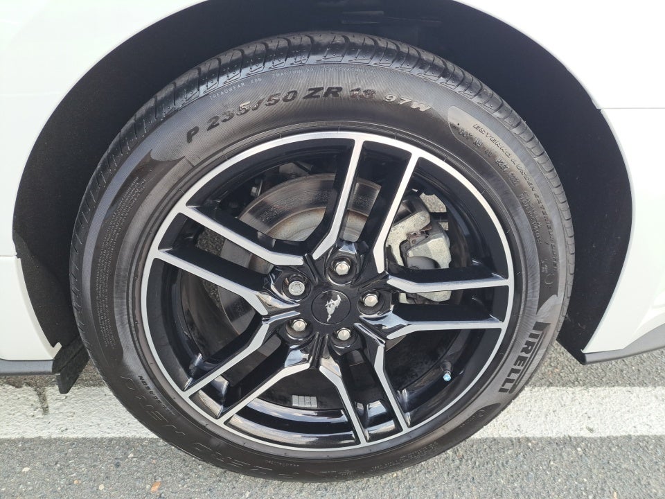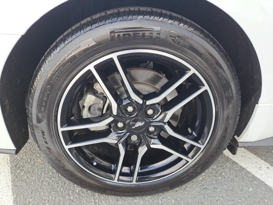 Complementing the Mustang's impressive performance is its sleek and athletic exterior. The striking white paint and bold design elements including the integrated turn signals and spoiler create a commanding presence on the road. The 18-inch machined-face aluminum wheels further accentuate the Mustang's sporty and sophisticated aesthetic.